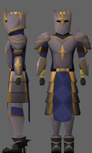 Justiciar faceguard (looks more like a full helm if you ask me), justiciar chestguard and justiciar legguards all require the user to have 75 DEF to wear. Together, armour pieces form a full set of justiciar armour which has a set effect. It reduces all combat damage taken, unfortunately this effect does not work in PvP.